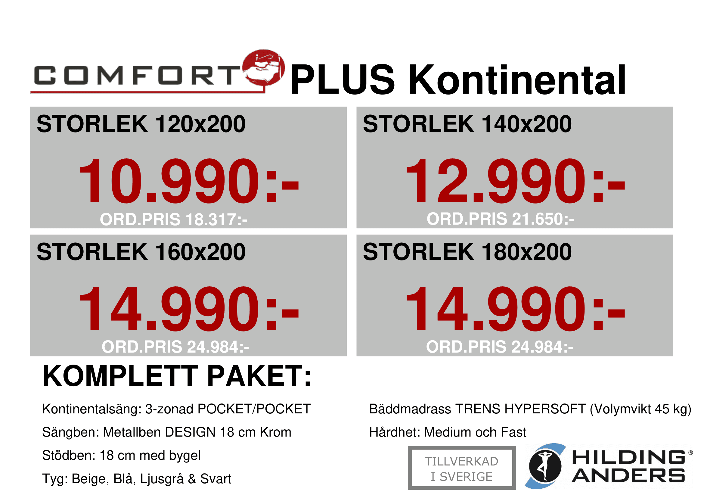 COMFORT PLUS Kontinental är en svensktillverkad säng med 3-zonade pocketresårer i plymån och pocketresårer i underbädden för extra hög följsamhet.