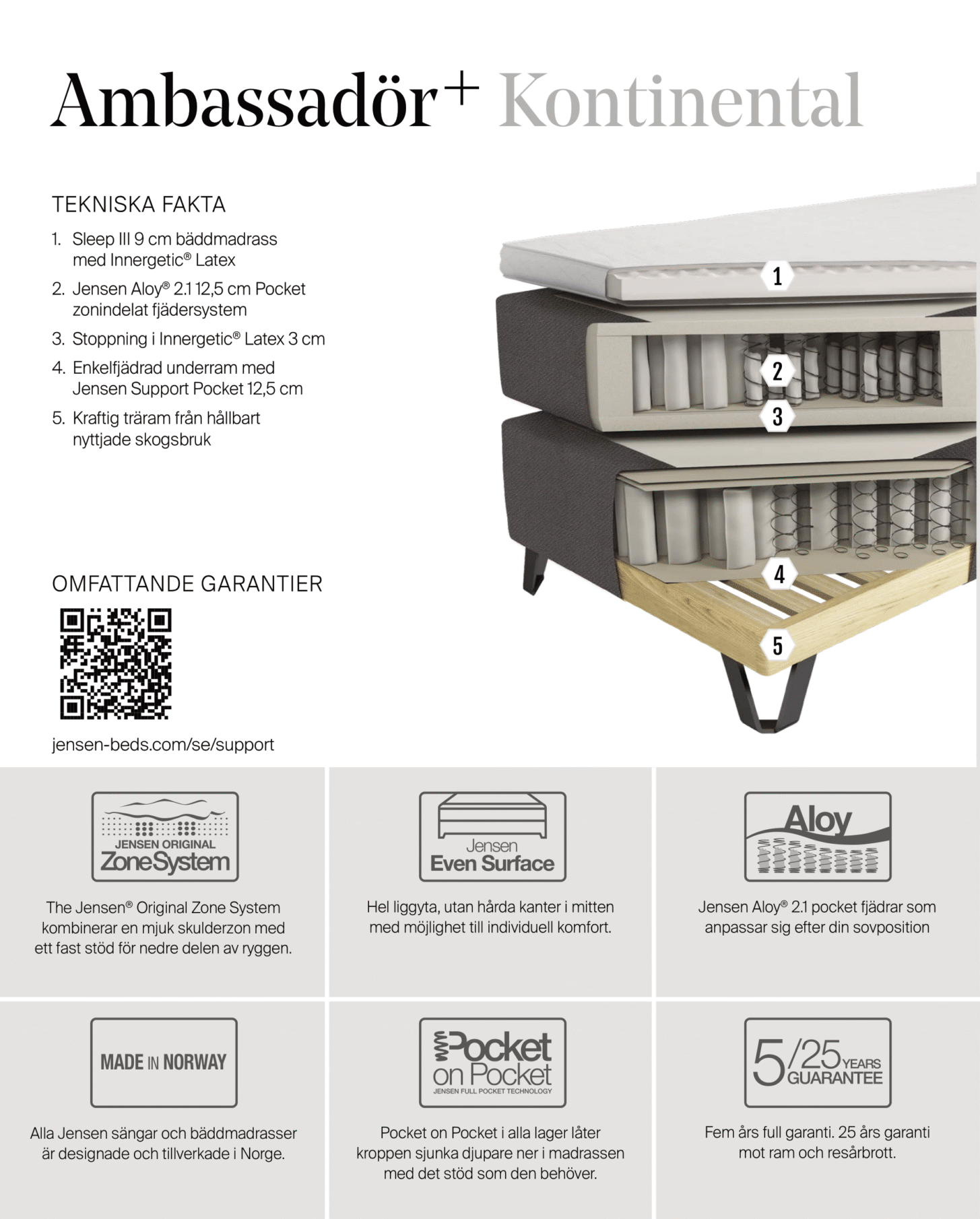 Samtliga Jensensängar har 5 års totalgaranti och 25 års garanti mot ram- och fjäderbrott.